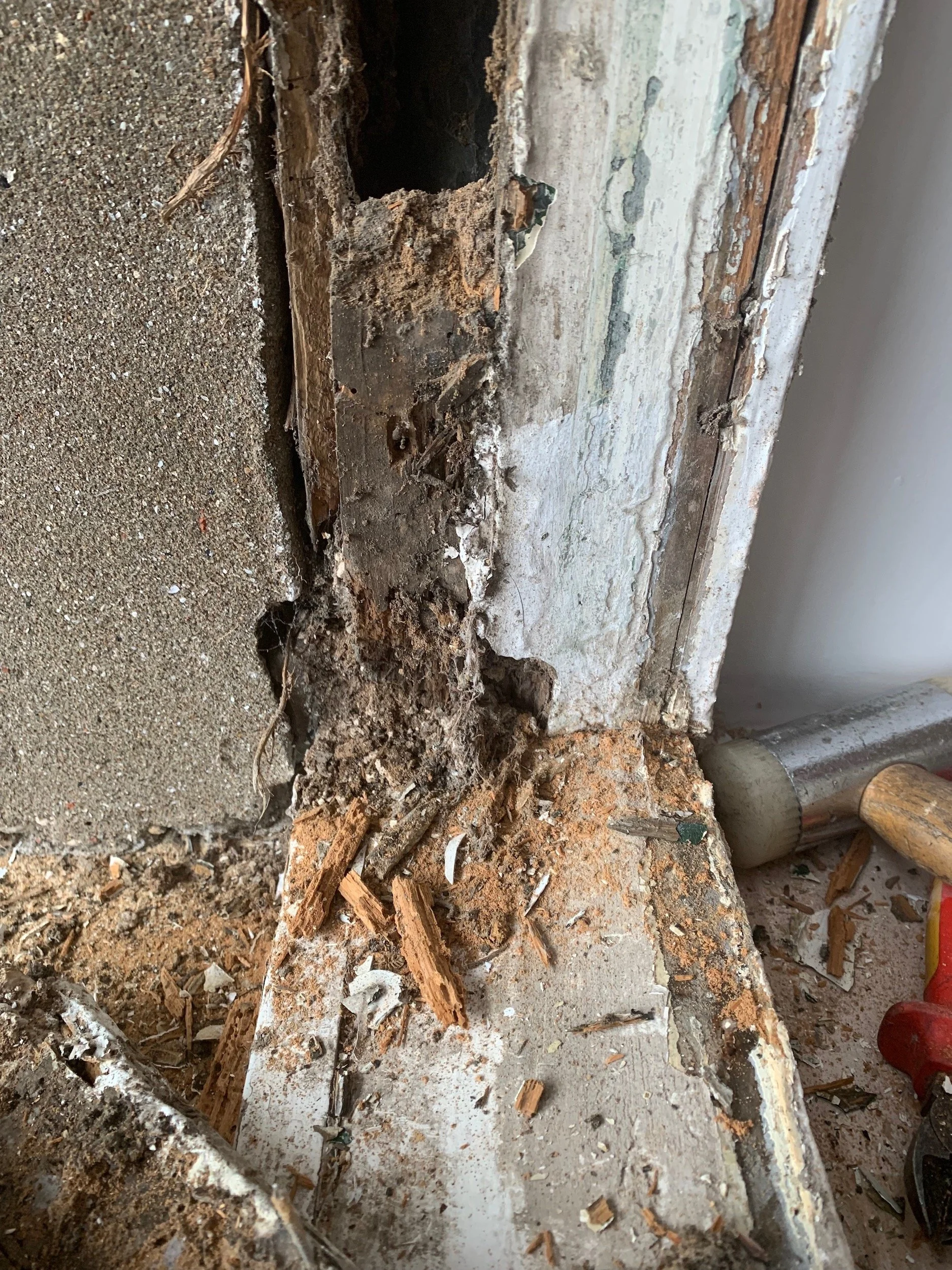 Despite extensive damage and decay, 7 of the 8 double-sash windows were successfully repaired and much of the unbroken original glass reclaimed and re-installed. The eighth window was so badly degraded that the frame and both sashes had to be completely re-made. Working directly from the other surviving windows and frames, the window was faithfully replicated to match the original exactly.